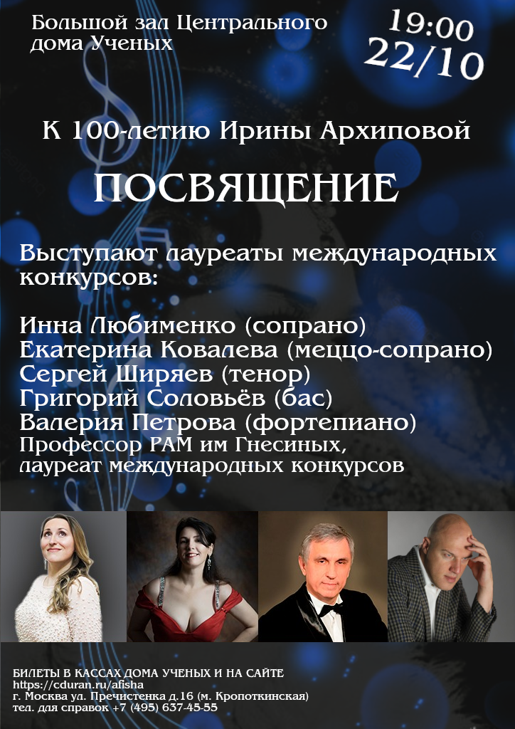 Инна Любименко (сопрано) солистка Фонда Евгения Светланова,участница многих оперных фестивалей,активно концертирует в Москве и Санкт-Петербурге.